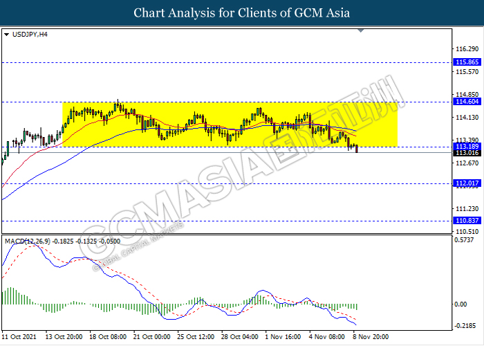 USDJPY, H4: USDJPY telah didagang dengan lebih rendah susulan dengan pemecahan pada tahap sokongan sebelumnya 113.20. MACD yang memaparkan isyarat momentum bearish yang berterusan mencadangkan pasangan in untuk melanjutkan kerugiannya ke arah tahap sokongan 112.00.