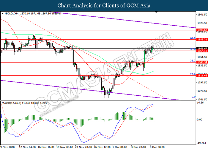 Bagi pasaran komoditi, harga minyak mentah telah menyusut sebanyak 0.07% ke $45.50 se tong semasa penulisan. Pasaran minyak mentah telah didagang dengan lebih rendah selepas data inventori yang suram telah dibebaskan. Menurut kepada American Petroleum Institute, inventori minyak mentah AS telah meningkat ke bacaan sebanyak 1.14 juta tong pada minggu lalu, lebih tinggi daripada jangkaan pasaran sebanyak -1.514M. Sebaliknya, harga emas telah menyusut sebanyak 0.05% ke $1869.25 se troy auns semasa penulisan susulan dengan optimisme terhadap pengembangan vaksin Covid-19 telah mencetuskan sentimen selera risiko dalam pasaran FX, yang selanjutnya mengurangkan permintaan pasaran terhadap aset selamat emas.