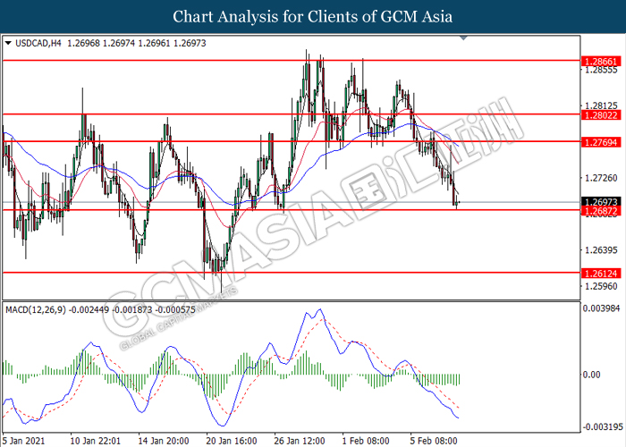 USDCAD, H4: USDCAD telah didagang dengan lebih rendah sementara ia sedang menguji tahap sokongan di 1.2685. MACD yang menunjukkan isyarat momentum bearish yang berterusan mencadangkan pasangan ini untuk didagang dengan lebih rendah selepas ia berjaya memecah tahap sokongan tersebut.