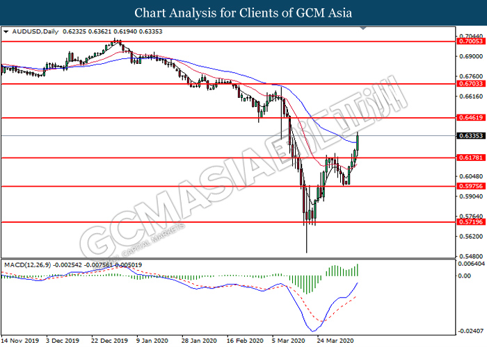AUDUSD, Daily: AUDUSD telah didagang dengan lebih tinggi selepas ia memecah tahap rintangan sebelumyan di 0.6180. MACD yang memaparkan isyarat momentum bullish yang berterusan mencadangkan pasangan ini untuk melanjutkan keuntungannya dan menuju ke arah tahap rintangan di 0.6460.