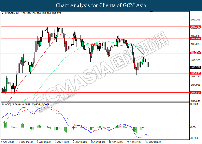 USDJPY, H1: USDJPY telah didagang dengan lebih rendah selepas ia berundur dari tahap rintangan 108.65. MACD yang memaparkan momentum bearish mencadangkan pasangan ini untuk melanjutkan kerugiannya ke arah tahap sokongan 108.25.