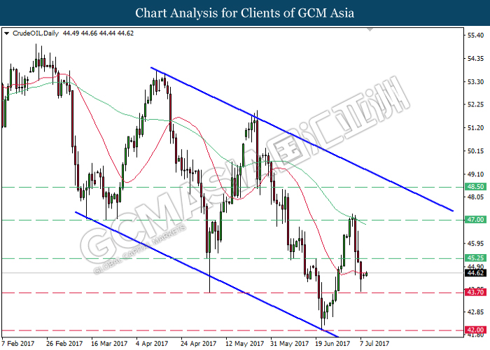 CrudeOIL, Daily: Harga minyak mentah kekal didagang di dalam saluran menurun dan ia telah melantun dari tahap sokongan 43.70 baru-baru ini. Penutupan niaga di atas garisan 20-moving average (merah) akan mencadangkan harganya untuk melanjutkan kenaikan ke tahap rintangan 45.25.