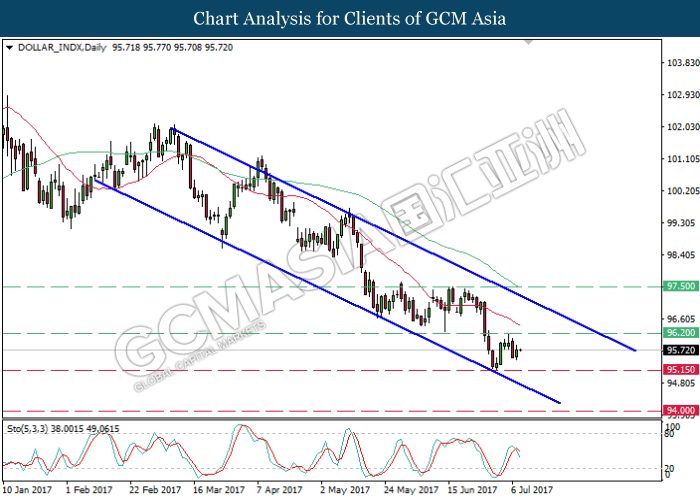 DOLLAR_INDX, Daily: Indeks dolar kekal didagang di dalam saluran menurun selepas ia berundur dari tahap rintangan 96.20. Stochastic Oscillator yang mula membentuk isyarat pengunduran mencadangkan indeks dolar untuk melanjutkan kerugiannya ke sasaran tahap sokongan di 95.15.