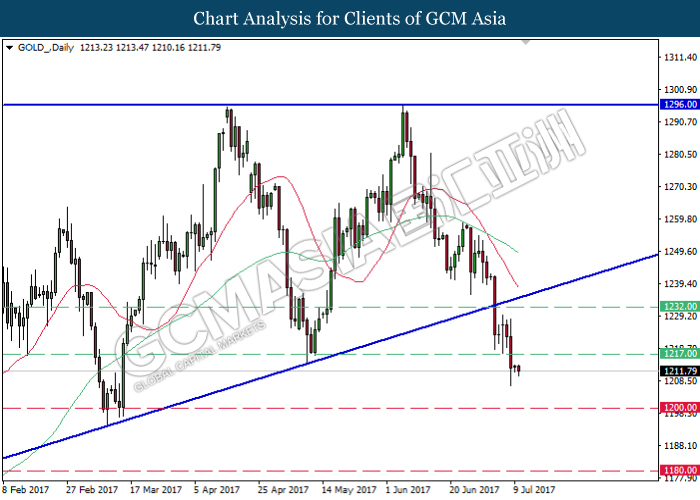 GOLD_, Daily: Harga emas telah melanjutkan kerugiannya selepas ia memecah keluar dari paras bawah segi tiga menaik. Kedua-dua garisan MA yang masih melebarkan jarak dan menuju ke bawah mencadangkan harga emas lebih cenderung untuk melanjutkan kerugiannya ke arah tahap sokongan 1200.00