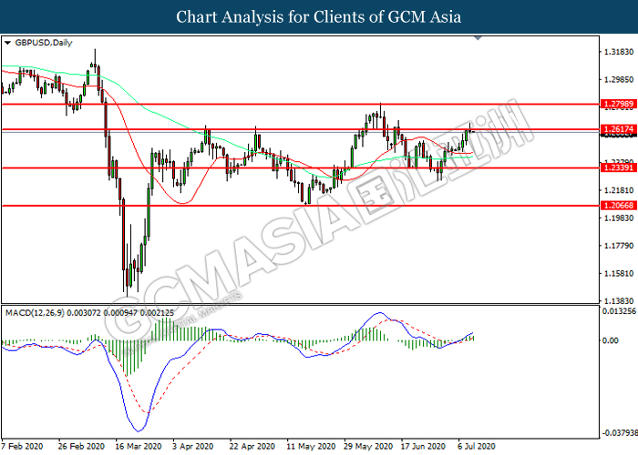 GBPUSD, Daily: GBPUSD telah didagang dengan lebih tinggi sementara kini menguji di tahap rintangan 1.2615. MACD yang memaparkan momentum bullish mencadangkan pasangan ini untuk melanjutkan keuntungannya selepas ia memecah tahap rintangan tersebut.