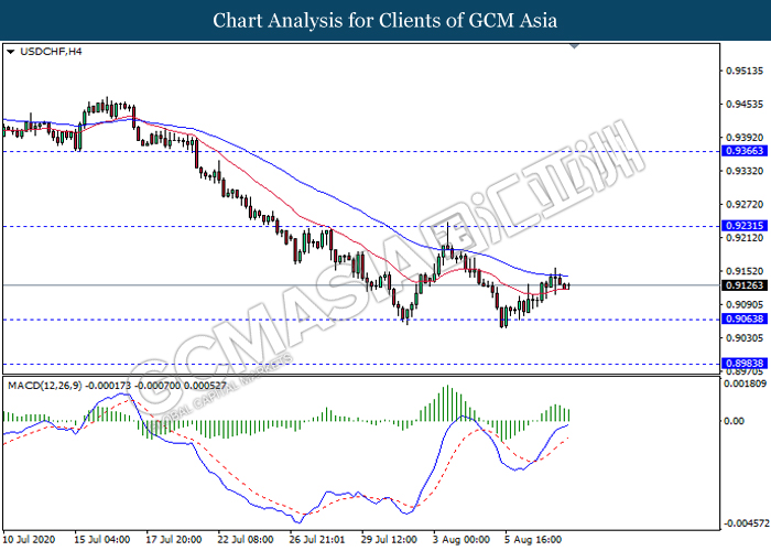 USDCHF, H4: USDCHF telah didagang dengan lebih tinggi susulan dengan lantunan dari tahap sokongan 0.9065. MACD yang memaparkan isyarat momentum bullish mencadangkan pasangan ini untuk melanjutkan lantunannya ke arah tahap rintangan 0.9230.