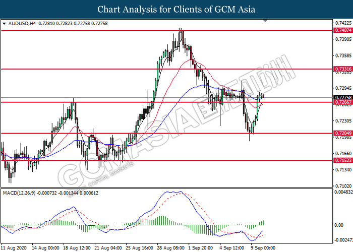 AUDUSD, H4: AUDUSD telah didagang dengan lebih tinggi selepas ia memecah tahap rintangan sebelumnya di 0.7265. MACD yang memaparkan isyarat momentum bullish yang berterusan mencadangkan pasangan ini untuk melanjutkan keuntungannya dan menuju ke arah tahap rintangan di 0.7330.