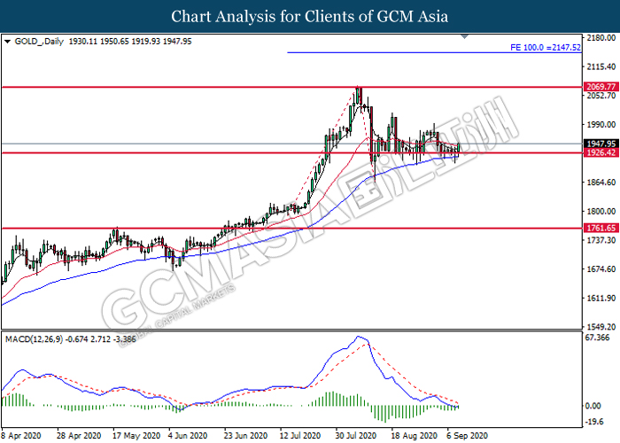 GOLD_, Daily: Harga emas telah didagang dengan lebih tinggi selepas ia melantun dari tahap sokongan di 1926.40. MACD yang memaparkan isyarat momentum bearish yang berkurangan mencadangkan komoditi ini untuk melanjutkan keuntungannya dan menuju ke tahap rintangan di 2069.75.