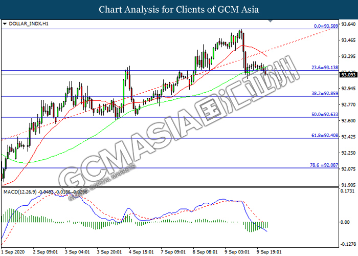 DOLLAR_INDX, H1: Indeks dolar telah didagang dengan lebih rendah selepas ia memecah tahap sokongan terdahulu 93.15. Namun, MACD yang memaparkan momentum bearish yang berkurangan mencadangkan indeks tersebut untuk mengalami pembetulan teknikal bagi jangak pendek.