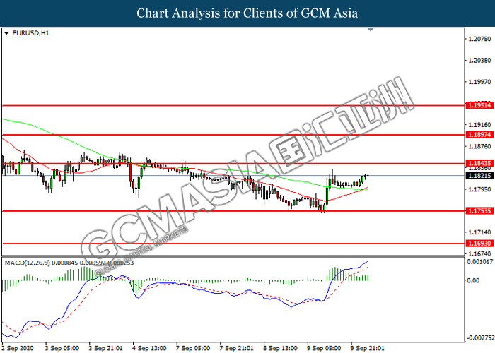 EURUSD, H1: EURUSD telah didagang dengan lebih tinggi sementara kini berhampiran dengan tahap rintangan 1.1845. MACD yang memaparkan momentum bullish mencadangkan pasangan ini untuk melanjutkan keuntungannya selepas ia memecah tahap rintangan tersebut.