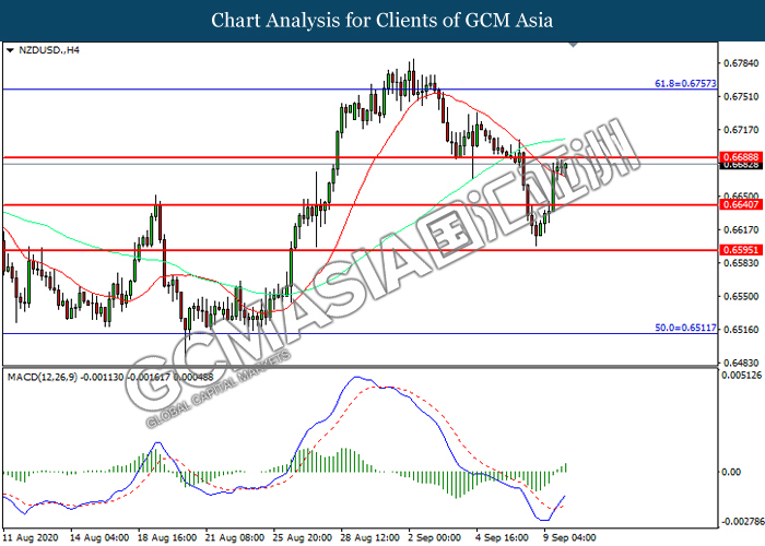 NZDUSD, H4: NZDUSD telah didagang dengan lebih tinggi sementara kini menguji di tahap rintangan 0.6690. MACD yang memaparkan momentum bullish mencadangkan pasangan ini untuk melanjutkan keuntungannya selepas ia memecah tahap rintangan tersebut.