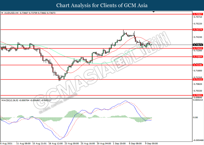AUDUSD, H4: AUDUSD telah didagang dengan lebih rendah sementara kini menguji di tahap sokongan 0.7340. Namun, MACD yang memaparkan momentum bearish yang berkurangan mencadangkan pasangan ini untuk mengalami pembetulan teknikal bagi jangka pendek.