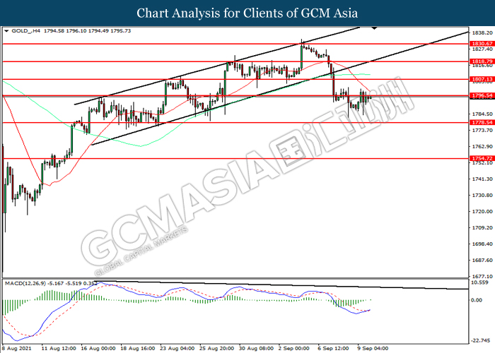 GOLD_, H4: Harga emas telah didagang dengan lebih tinggi sementara kini menguji di tahap rintangan 1796.55. MACD yang memaparkan momentum bullish mencadangkan komoditi ini untuk melanjutkan keuntungannya selepas ia memecah tahap rintangan tersebut.