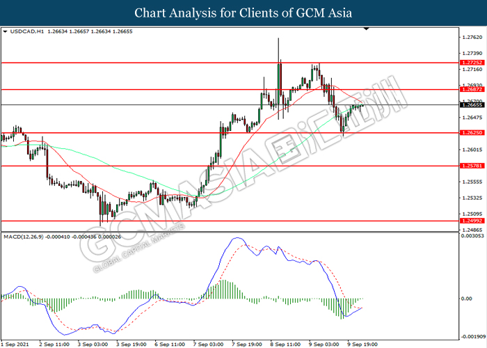 USDCAD, H1: USDCAD telah didagang dengan lebih tinggi selepas ia melantun dari tahpa sokongan 1.2625. MACD yang memaparkan momentum bearish yang berkurangan mencadangkan pasangan ini untuk melanjutkan keuntungannya ke arah tahap rintangan 1.2690.