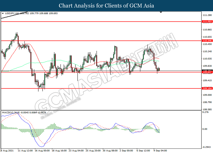 USDJPY, H4:USDJPY telah didagang dengan lebih rendah sementara kini menguji di tahap sokongan 109.65. MACD yang memaparkan momentum bearish mencadangkan pasangan ini untuk melanjutkna kerugiannya selepas ia memecah tahap sokongan tersebut.