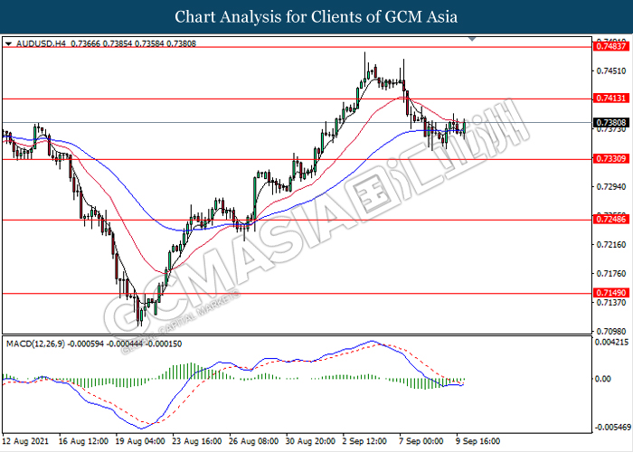 AUDUSD, H4: AUDUSD telah didagang dengan lebih rendah susulan dengan lantunan dari paras rendahnya. MACD yang memaparkan isyarat momentum bearish yang berkurangan mencadangkan pasangan ini untuk melanjutkan lantunannya ke arah tahap rintangan 0.7415.