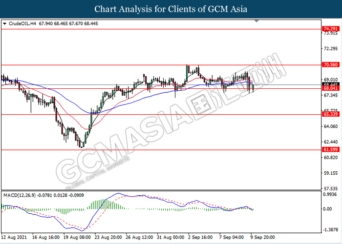 CrudeOIL, H4: Harga minyak mentah telah didagang dengan lebih rendah sementara ia sedang menguji tahap sokongan 68.05. MACD yang memaparkan isyarat bias bearish mencadangkan komoditi ini untuk melanjutkan kerugiannya selepas ia memecah tahap sokongan tersebut.