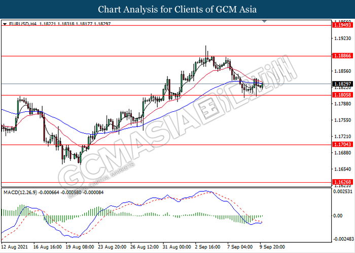 EURUSD, H4: EURUSD telah didagang dengan lebih tinggi susulan dengan lantunan dari tahap sokongan 1.1805. MACD yang memaparkan isyarat momentum bearish yang berkurangan mencadangkan pasangan ini untuk melanjutkan lantunannya ke arah tahap rintangan 1.1885.