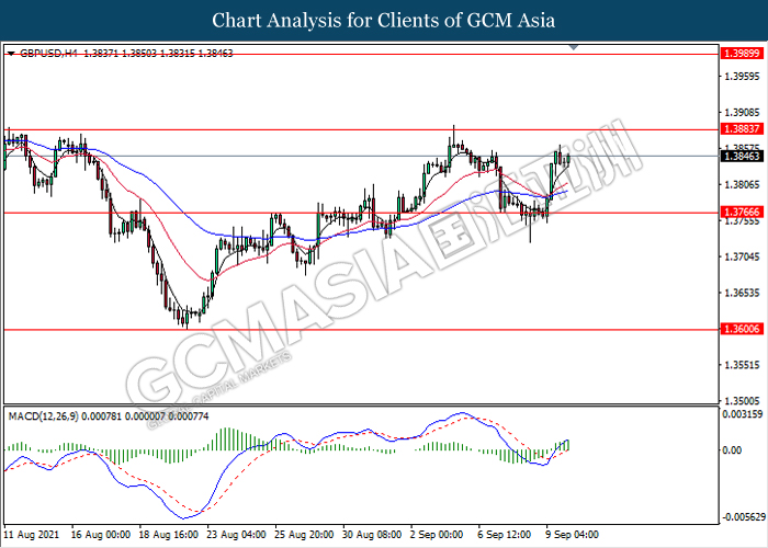 GBPUSD, H4: GBPUSD telah didagang dengan lebih tinggi sementara ia sedang menguji berhampiran dengan tahap rintangan 1.3885. MACD yang memaparkan isyarat momentum bullish mencadangkan pasangan ini untuk melanjutkan keuntungannya selepas ia memecah tahap rintangan tersebut.