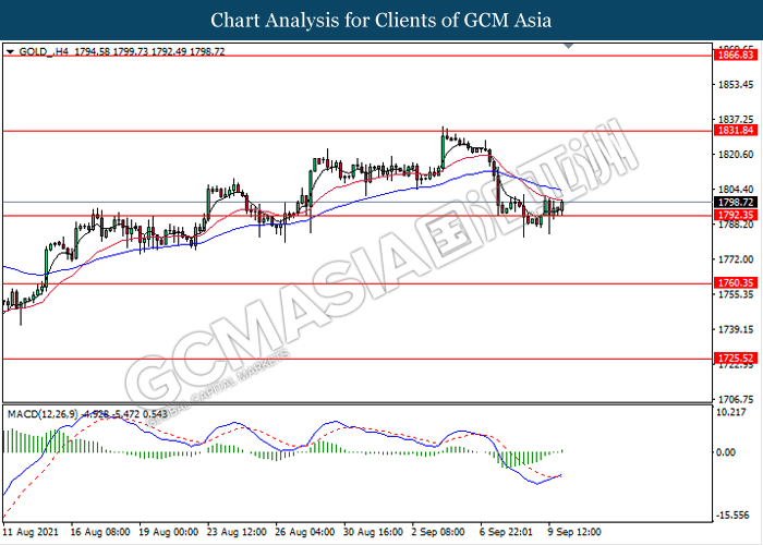 GOLD, H4: Harga emas telah didagang dengan lebih tinggi susulan dengan lantunan dari tahap sokongan 1792.35. MACD yang memaparkan isyarat momentum bullish mencadangkan komoditi ini untuk melanjutkan keuntungannya ke arah tahap rintangan 1831.85.