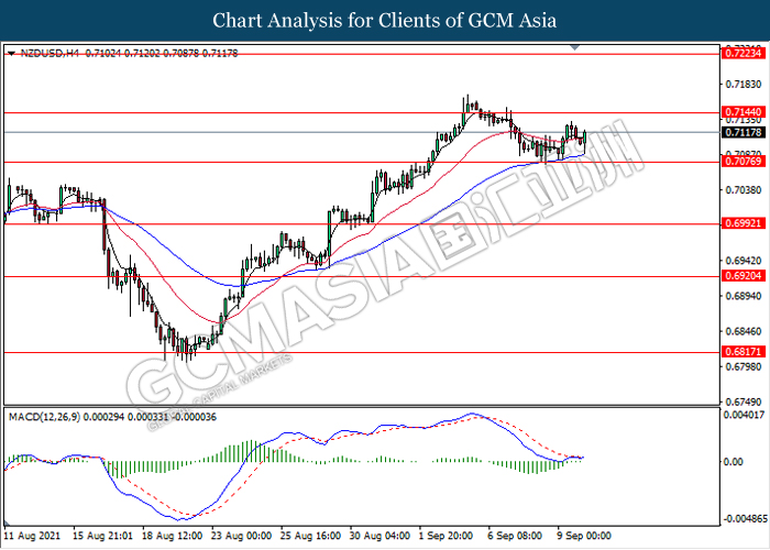 NZDUSD, H4: NZDUSD telah didagang dengan lebih tinggi susulan dengan lantunan dari paras rendahnya. MACD yang memaparkan isyarat bias bullish dengan formasi silang emas mencadangkan pasangan ini untuk melanjutkan lantunannya ke arah tahap rintangan 0.7145.