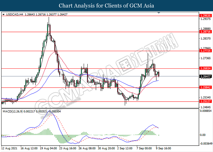 USDCAD, H4: USDCAD telah didagang dengan lebih rendah susulan dengan pengunduran dari tahap rintangan 1.2685. MACD yang memaparkan isyarat momentum bearish dengan formasi silang kematian mencadangkan pasangan ini untuk melanjutkan kerugiannya ke arah tahap sokongan 1.2585.
