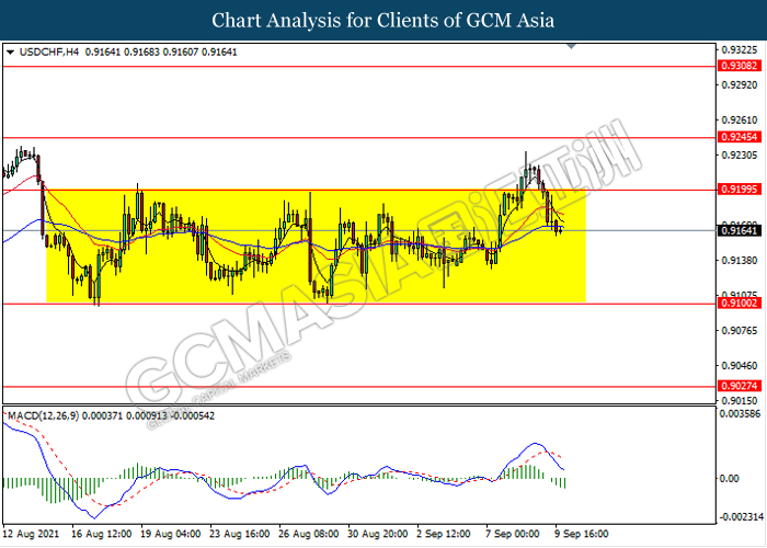 USDCHF, H4: USDCHF kekal didagang dalam saluran sisi susulan dengan pengunduran dari tahap rintangan 0.9200. MACD yang memaparkan isyarat momentum bearish dengan formasi silang kematian mencadangkan pasangan ini untuk melanjutkan kerugiannya ke arah tahap sokongan 0.9100.