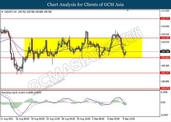 USDJPY, H4: USDJPY kekal didagang dalam saluran sisi susulan dengan lantunan dari tahap sokongan 109.60. Namun, MACD yang memaparkan isyarat momentum bearish yang berkurangan mencadangkan pasangan ini untuk melanjutkan lantunannya ke arah tahap rintangan 110.20.