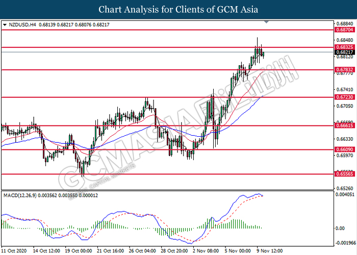 NZDUSD, H4: NZDUSD telah didagang dengan lebih tinggi sementara ia sedang menguji tahap rintangan di 0.6835. Namun, MACD yang memaparkan isyarat momentum bullish yang berkurangan mencadangkan pasangan ini untuk mengalami pembetulan teknikal dan menuju ke paras yang lebih rendah.