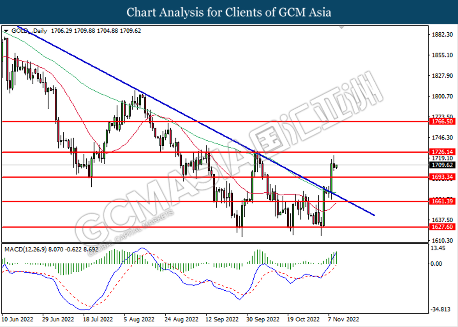 Dalam pasaran komoditi, harga minyak mentah turun sebanyak -0.05% ke $85.75 setong apabila Pegawai Kesihatan China itu bertegas untuk mengekalkan dasar “Sifar Covid” mereka, yang boleh mengurangkan permintaan minyak pada masa hadapan. Selain itu, harga emas meningkat sebanyak 0.08% ke $1708.05 setiap troy auns di tengah-tengah penurunan inventori sedikit dalam pasaran dolar AS.