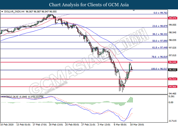 Indeks dolar telah meneruskan penurunannya terhadap sebakul enam pasangan mata wang utama semasa sesi Asia lewat berikutan dengan ketakutan terhadap koronavirus kekal berterusan. Tidak lama dahulu, dolar telah memulih sesetengah keuntungannya selepas para pelabur berharap bahawa penggubal dasar kewangan global akan mencadangkan rangsangan yang lebih lanjut untuk menyokong ekonomi yang dijejaskan oleh gangguan pelancongan dan perdagangan. Namun, oleh kerana koronavirus kekal menyebar ke seluruh dunia, ketakutan di kalangan pelabur masih menguasai sentimen secara keseluruhan. Pusat Kawalan dan Pencegahan Penyakit Amerika Syarikat (CDC) telah melaporkan peningkatan sebanyak 224 kes, membawa jumlah jangkitan ke 696. Pada masa yang sama, jumlah kematian telah meningkat sebanyak 6 kepada 25. Pelabur menjangkakan bahawa Fed akan mengurangkan kadar selanjutnya sebanyak 50 mata asas pada minggu depan dan ini akan mengurangkan kelebihan hasil dolar dan daya tarikan dolar. Pada masa penulisan, indeks dolar telah jatuh 0.28% kepada 96.05.