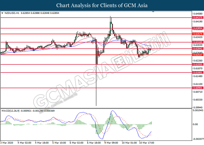 NZDUSD, H1: NZDUSD telah didagang dengan lebih tinggi sementara ia sedang menguji tahap rintangan di 0.6285. MACD yang memaparkan momentum bullish yang berterusan mencadangkan pasangan ini untuk melanjutkan keuntungannya selepas ia memecah tahap rintnagan tersebut.