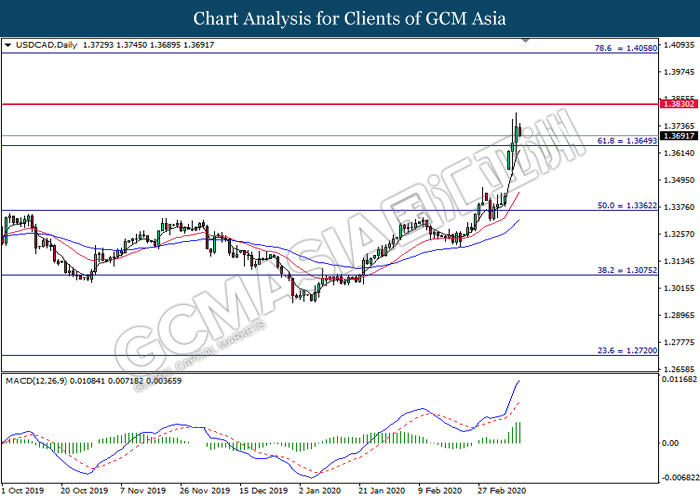 USDCAD, Daily: USDCAD telah didagang dengan lebih rendah selepas ia berundur dari tahap yang lebih tinggi. MACD yang memaparkan momentum bullish yang berkurangan mencadangkan pasangan ini untuk melanjutkan kerugiannya dan menuju ke arah tahap sokongan di 1.3650.