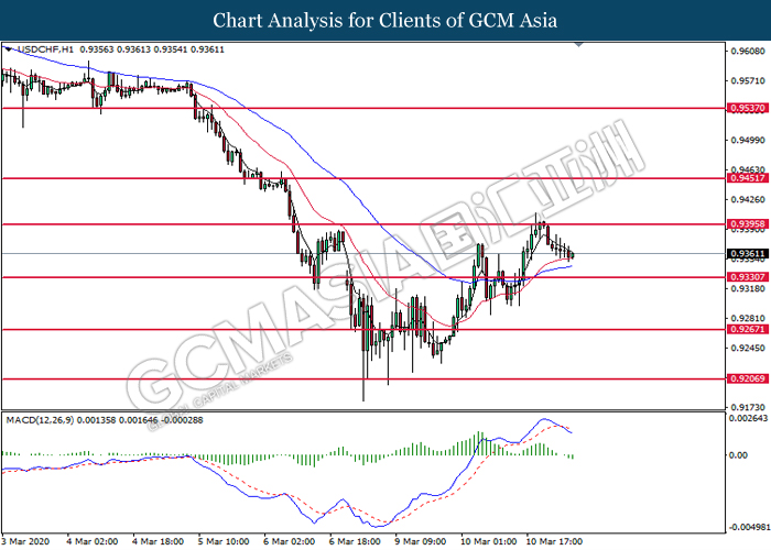 USDCHF, H1: USDCHF telah didagang dengan lebih rendah selepas ia berundur dari tahap rintangan 0.9395. MACD yang memaparkan momentum bearish mencadangkan pasangan ini untuk melanjutkan kerugiannya dan menuju ke arah tahap sokongan di 0.9330.
