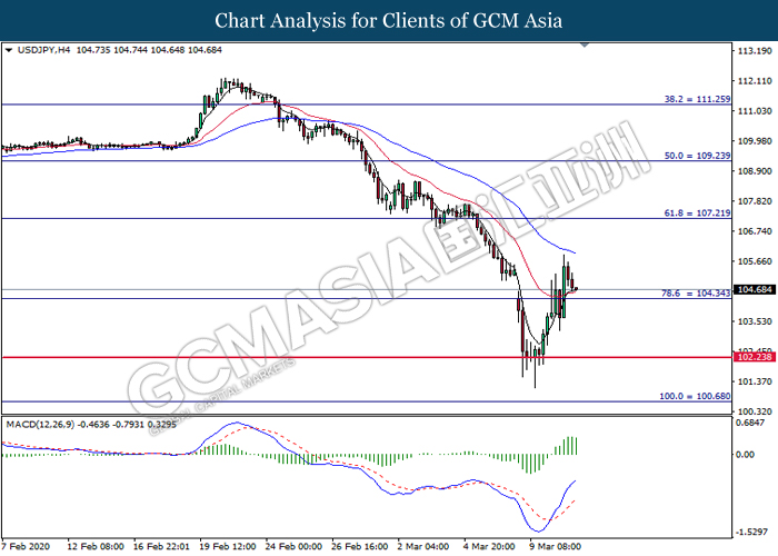 USDJPY, H4: USDJPY telah didagang dengan lebih rendah selepas ia berundur dari tahap tinggi. MACD yang memaparkan momentum bullish yang berkurangan mencadangkan pasangan ini untuk melanjutkan kerugiannya dan menuju ke arah tahap sokongan di 104.35.