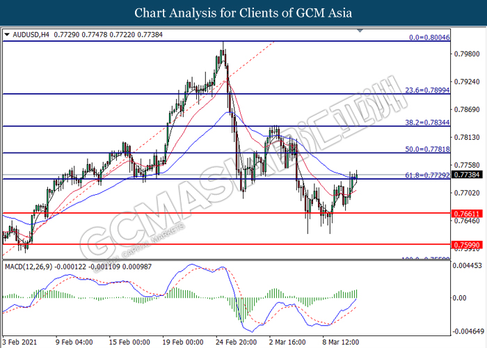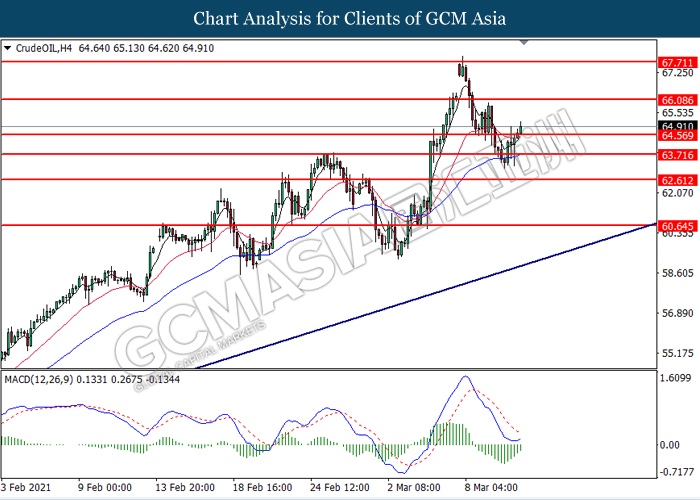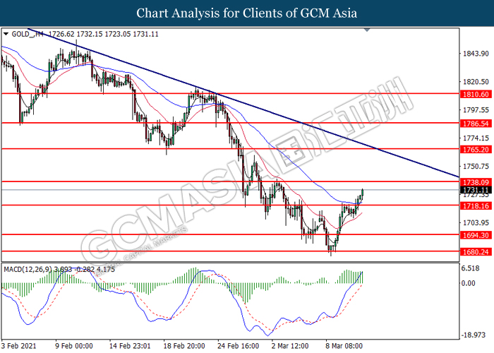 Di pasaran komoditi, harga minyak mentah meningkat sebanyak 0,45% kepada $ 64,92 setong semasa penulisan berikutan dengan pandangan ekonomi yang positif. Dewan Perwakilan A.S. telah memberikan persetujuan akhir pada hari Rabu untuk salah satu rangsangan ekonomi terbesar dalam A.S. Rangsangan tersebut dijangka dapat membantu mempercepat pemulihan ekonomi di AS dan meningkatkan permintaan minyak mentah dalam masa yang terdekat. Sebaliknya, harga emas meningkat sebanyak 0.27% kepada $ 1731.45 se troy auns pada masa penulisan berikutan dengan kelemahan dolar AS.
