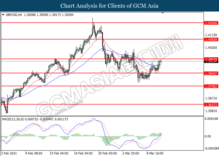 GBPUSD, H4: GBPUSD telah didagang dengan lebih tinggi sementara ia sedang menguji tahap rintangan di 1.3945. MACD yang memaparkan isyarat momentum bullish yang berterusan  mencadangkan pasangan ini untuk melanjutkan keuntungannya selepas ia memecah tahap rintangan tersebut.