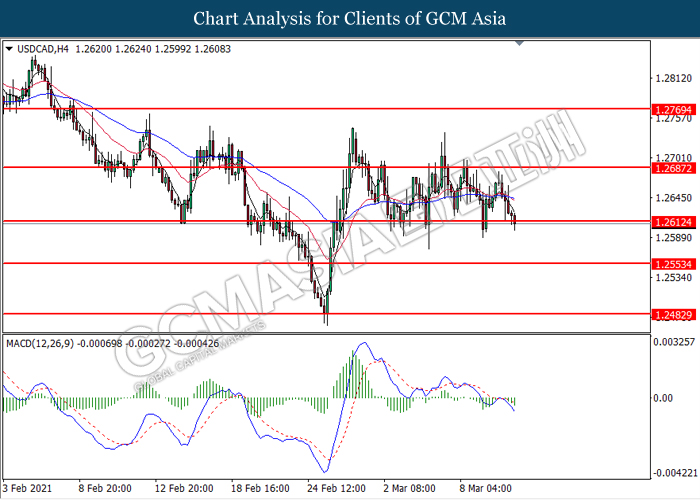 USDCAD, H4: USDCAD telah didagang dengan lebih rendah sementara ia sedang menguji tahap sokongan di 1.2610. MACD yang menunjukkan isyarat momentum bearish yang berterusan mencadangkan pasangan ini untuk didagang dengan lebih rendah selepas ia memecah tahap sokongan tersebut.