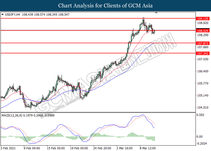 USDJPY, H4: USDJPY telah didagang dengan lebih tinggi selepas ia melantun dari tahap yang lebih rendah. Namun, MACD yang memaparkan isyarat momentum bearish yang berterusan mencadangkan pasangan ini untuk didagang dengan lebih rendah dalam jangka masa yang pendek.