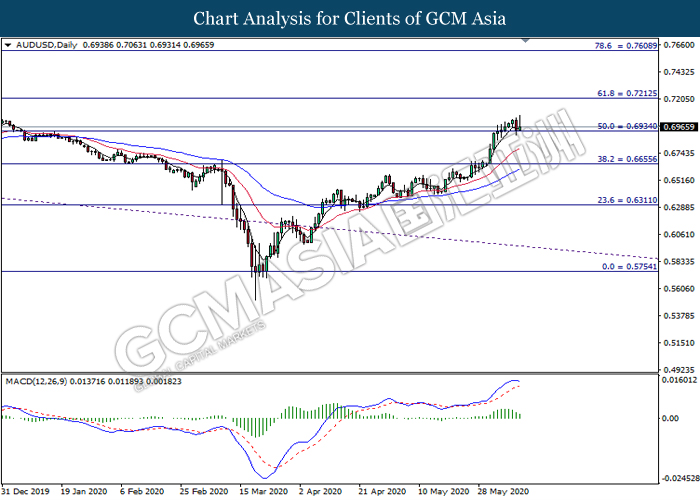 Dalam pasaran komoditi, harga minyak mentah menyusut 2.40% ke $38.65 setong disebabkan oleh peningkatan inventori minyak mentah di AS. Menurut kepada EIA, tahap inventori minyak mentah AS meningkat sebanyak 5.720 juta pada minggu 5 Jun, lebih tinggi daripada ramalan dengan penurunan sebanyak 1.738 juta, ia telah menghidupkan semula kebimbangan pelabur bahawa keadaan ketidakseimbangan antara pembekalan dan permintaan di pasaran komoditi hitam ini. Selain itu, harga emas naik 0.02% kei $1735.85 setroy auns di tengah-tengah pelabur melarikan diri ke aset selamat berikutan dengan kenyataan dovish diberikan daripada Jerome Powell.
