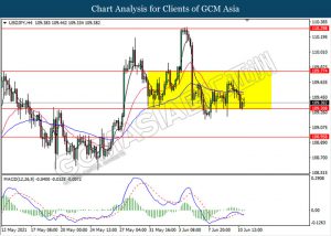USDJPY, H4: USDJPY kekal didagang dalam saluran sisi sementara ia sedang menguji tahap sokongan 109.30. Namun, MACD yang memaparkan isyarat momentum bearish dengan formasi silang kematian mencadangkan pasangan ini untuk melanjutkan kerugiannya selepas ia memecah tahap sokongan tersebut.