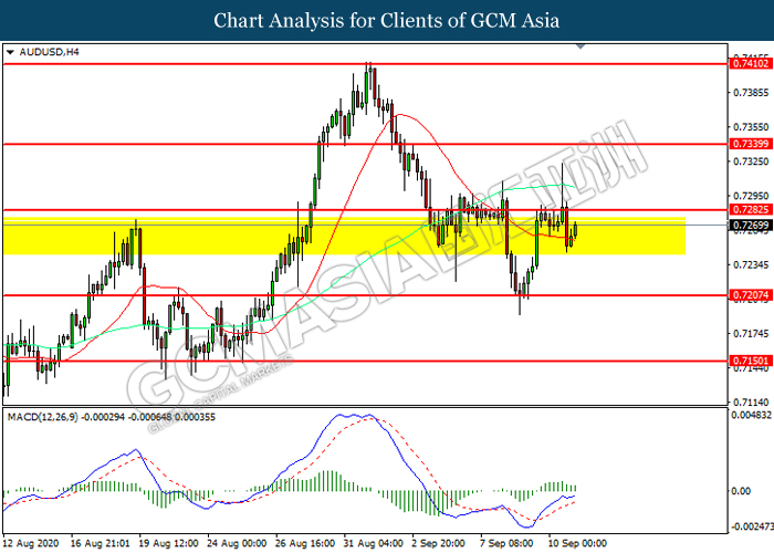 AUDUSD, H4: AUDUSD telah didagang dengan lebih rendah selepas ia berundur dari tahap rintangan 0.7285. Namun, MACD yang memaparkan momentum bullish mencadangkan pasangan ini untuk mengalami pembetulan teknikal bagi jangka pendek.