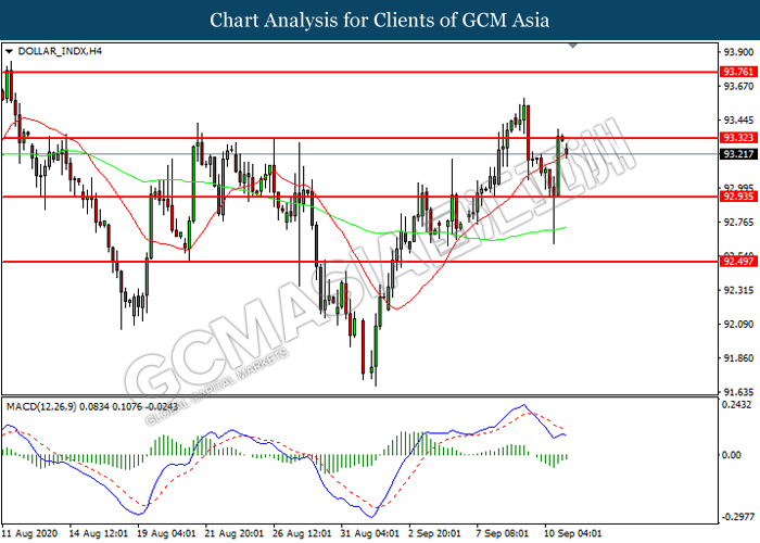 DOLLAR_INDX, H4: Indeks dolar telah didagang dengan lebih tinggi sementara kini menguji di tahap rintangan 93.30. MACD yang memaparkan momentum bearish yang berkurangan mencadangkan indeks tersebut untuk melanjutkan keuntungannya selepas ia memecah tahap rintangan tersebut.