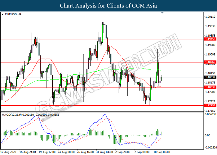 EURUSD, H4: EURUSD telah didagang dengan lebih tinggi selepas ia melantun dari tahap sokongan 1.1805. Namun, MACD yang memaparkan momentum bullish yang berkurangan mencadangkan pasangan ini untuk mengalami pembetulan teknikal bagi jangka pendek.