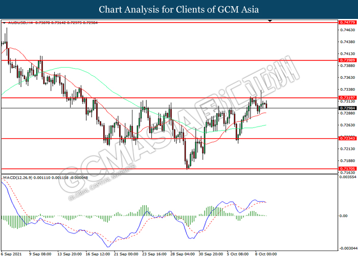 AUDUSD, H4: AUDUSD telah didagang dengan lebih tinggi sementara kini menguji di tahap rintangan 0.7320. Namun, MACD yang memaparkan momentum bullish yang berkurangan mencadangkan pasangan ini untuk mengalami pembetulan teknikal bagi jangka pendek.