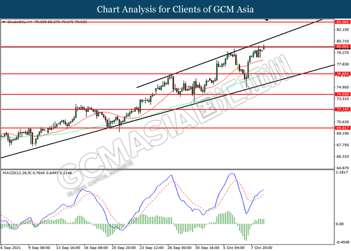 CrudeOIL, H4: Harga minyak mentah telah didagang dengan lebih tinggi sementara kini menguji di tahap rintangan 80.00. MACD yang memaparkan momentum bullish mencadangkan komoditi ini untuk melanjutkan keuntungannya selepas ia memecah tahap rintangan tersebut.