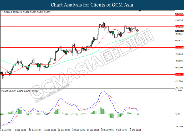 DOLLAR_INDX, H4: Indeks dolar telah didagang dengan lebih tinggi sementara kini menguji di tahap rintangan 94.25. Namun, MACD yang memaparkan momentum bullish yang berkurangan mencadangkan indeks tersebut untuk mengalami pembetulan teknikal bagi jangka pendek.
