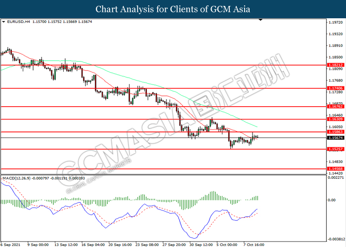 EURUSD, H4: EURUSD telah didagang dengan lebih tinggi selepas ia melantun dari tahap sokongan 1.1525. MACD yang memaparkan momentum bullish mencadangkan pasangan ini untuk melanjutkan keuntungannya ke arah tahap rintangan 1.1585.