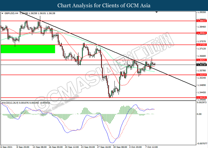 GBPUSD, H4: GBPUSD telah didagang dengan lebih tinggi sementara kini menguji di tahap rintangan 1.3640. MACD yang memaparkan momentum bullish mencadangkan pasangan ini untuk melanjutkan keuntungannya selepas ia memecah tahap rintangan tersebut.