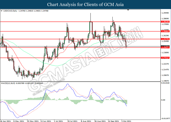 USDCAD, Daily: USDCAD telah didagang dengan lebih rendah sementara kini menguji di tahap sokongan 1.2455. MACD yang memaparkan momentum bearish mencadangkan pasangan ini untuk melanjutkan kerugiannya selepas ia memecah tahap sokongan tersebut.